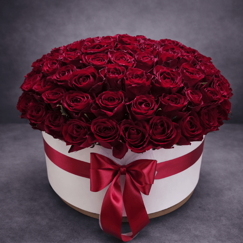 Ovaj raskošni aranžman od 101 crvene ruže u okruglom boksu predstavlja simbol ljubavi, strasti i luksuza. Ruže su pažljivo složene u premium kutiju sa elegantnom satenskom trakom, stvarajući impresivan i sofisticiran poklon.