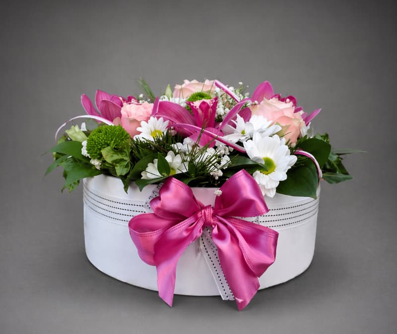 Nežan aranžman u elegantnoj beloj kutiji sa mašnom, ispunjen ružama i pažljivo odabranim sezonskim cvećem u roze i belim tonovima. Razigrana kombinacija boja i tekstura daje ovom aranžmanu posebnu toplinu i šarm.