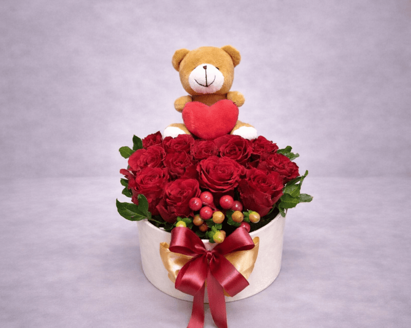 Ovaj nežan i upečatljiv aranžman sastoji se od bogatih crvenih ruža, dekorativnog zelenila i ukrasnih detalja, pažljivo složenih u elegantnoj kutiji. Na vrhu aranžmana nalazi se plišani meda sa srcem, koji simbolizuje ljubav, pažnju i toplinu.
