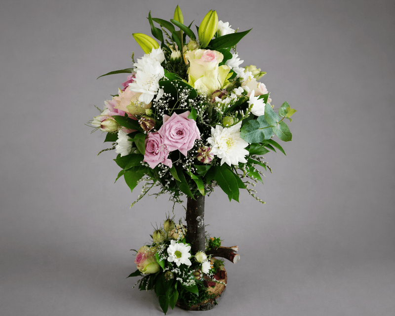 Ovaj jedinstveni cvetni aranžman na drvetu predstavlja spoj prirodne elegancije i moderne floristike. Centralni deo čini dekorativno drvo koje nosi bogatu cvetnu kompoziciju od ruža, hrizantema, ljiljana i sezonskog cveća u nežnim pastelim tonovima.