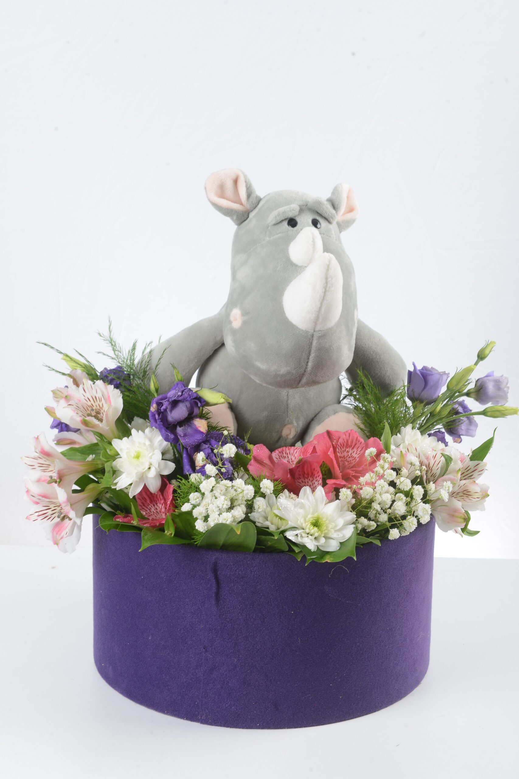 Aranžman 62, alstromerija, lizijantus, gipsofila sa plišanom igračkom