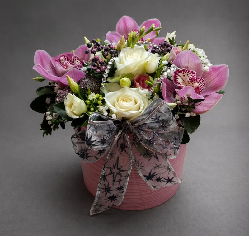 Nežan i elegantan aranžman koji kombinuje orhideje i ruže u harmoničnim tonovima bele i roze boje, smešten u dekorativnu kutiju sa mašnom. Ovaj aranžman odiše nežnošću i toplinom, savršen za poklon dragoj osobi.