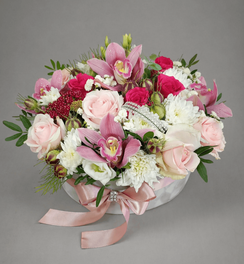 Ovaj sofisticirani cvetni aranžman odiše elegancijom i nežnošću, kombinujući raskošne orhideje, ruže i bogato sezonsko cveće u harmoničnoj kompoziciji. Pastelni tonovi roze, bele i ciklama nijanse čine ga izuzetno atraktivnim i idealnim za posebne prilike.