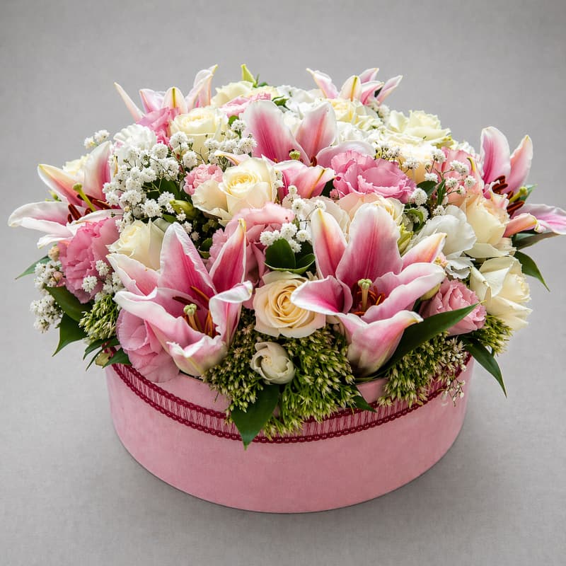 Ovaj sofisticirani cvetni aranžman kombinuje raskošne ljiljane i nežne ruže u skladnoj, romantičnoj kompoziciji. Pastelne nijanse roze i bele boje daju mu eleganciju i toplinu, dok gipsofila i dekorativno zelenilo dodatno naglašavaju njegovu bogatu formu.