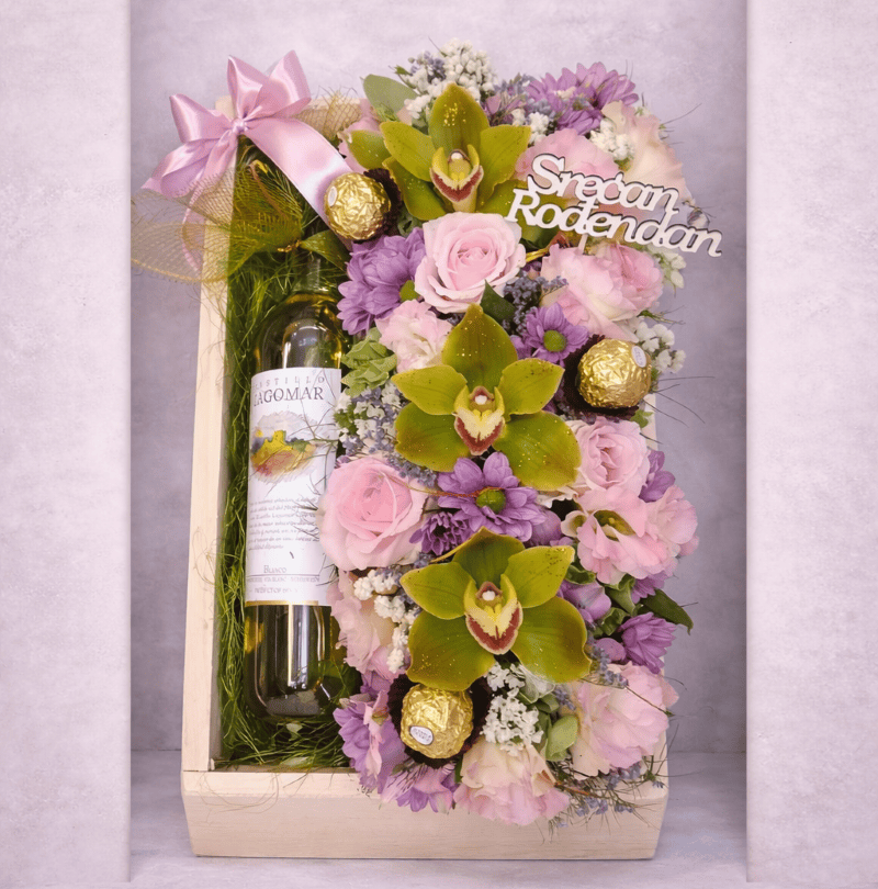 Ovaj pažljivo aranžiran poklon sadrži kvalitetno belo vino, sveže cveće i Ferrero Rocher čokolade, uklopljene u elegantnu drvenu kutiju. Bogata kombinacija ruža, orhideja i sezonskog cveća u nežnim tonovima čini ovaj aranžman vizuelno atraktivnim i izuzetno sofisticiranim poklonom.