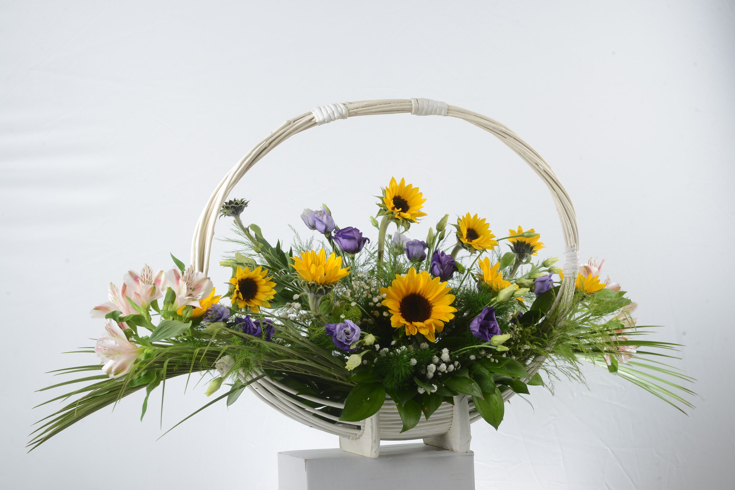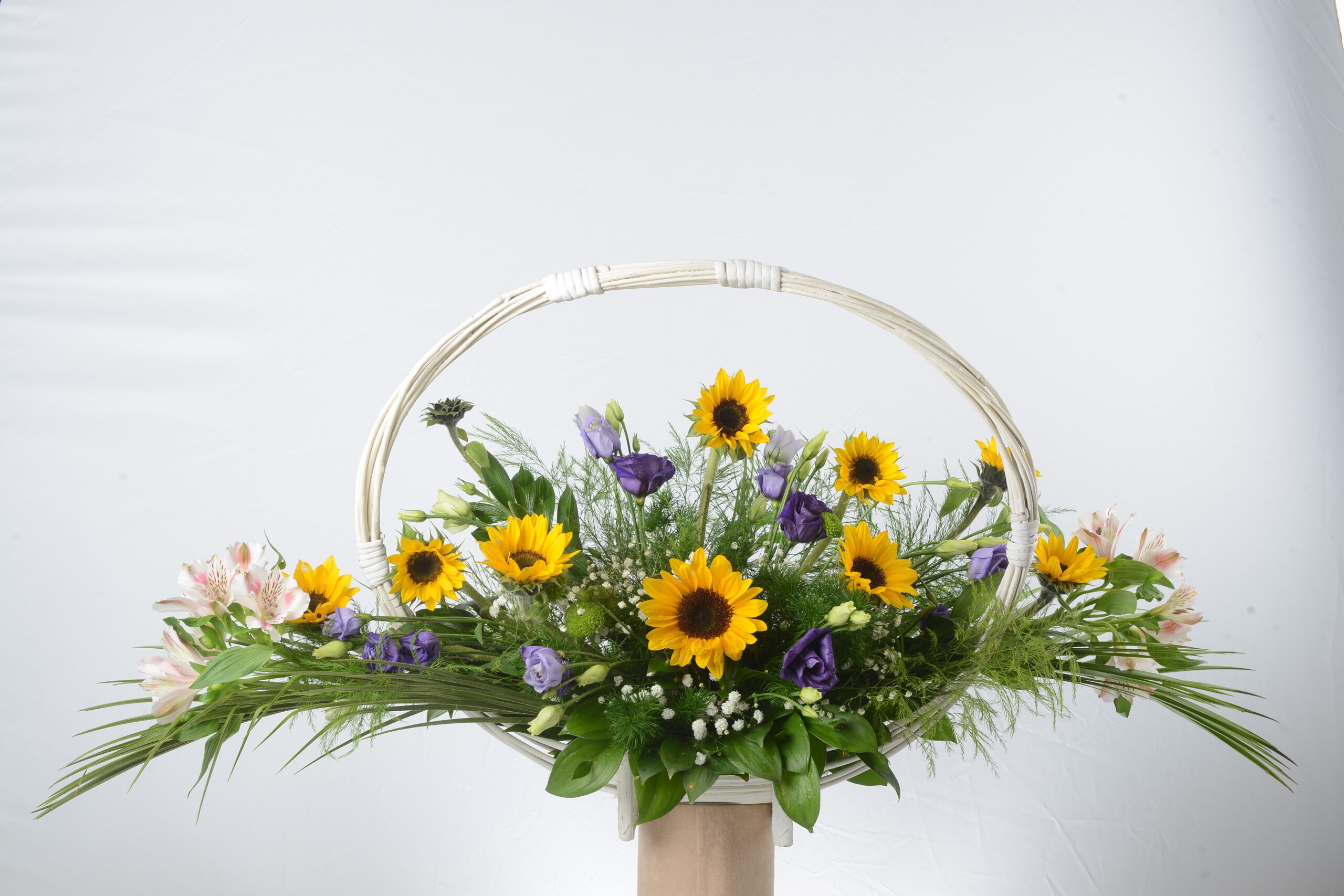 Aranžman: ukrasni suncokret, alstromerija, lizijantus i zelenilo u beloj čamac korpi.