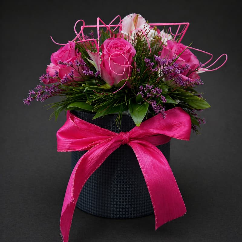 Šarmantan aranžman u kutiji sa roze ružama, upotpunjen dekorativnim zelenilom i pažljivo biranim detaljima. Elegantna kutija i upečatljiva mašna daju ovom aranžmanu poseban “poklon efekat” – spreman da obraduje na prvi pogled.