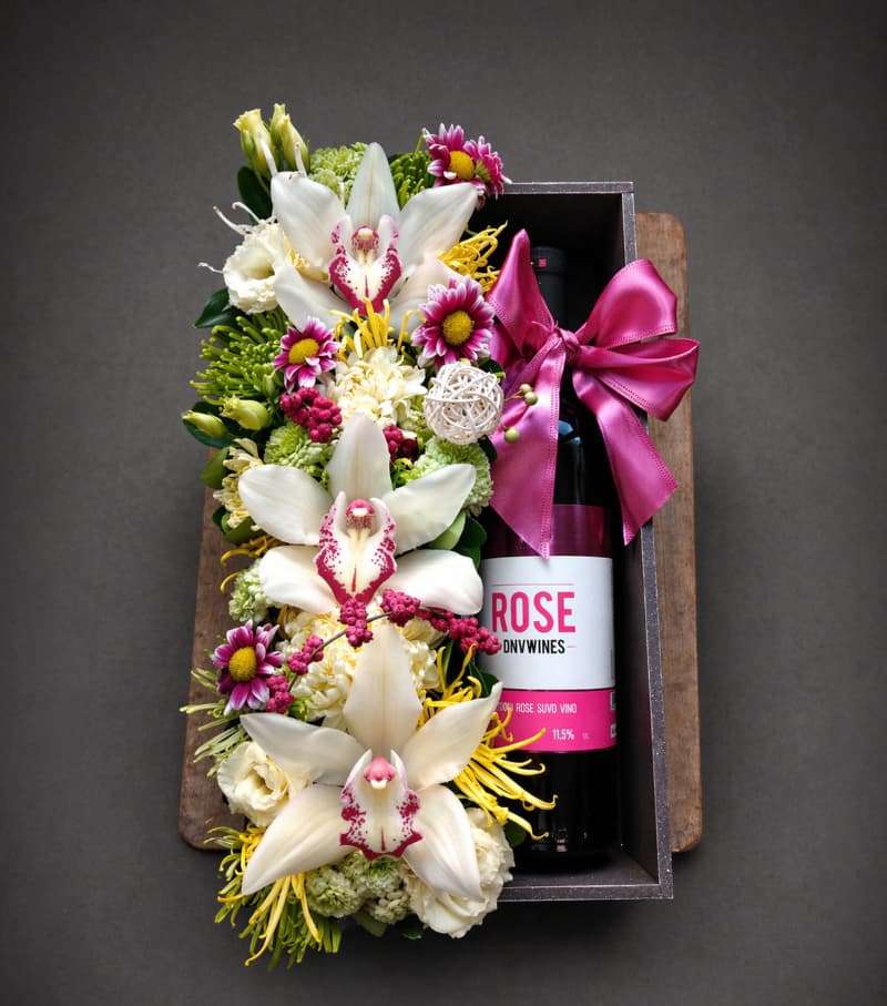 Elegantan spoj cveća i vina u jedinstvenom aranžmanu koji ostavlja snažan utisak. U modernoj kutiji nalazi se pažljivo aranžirano sveže cveće – orhideje, hrizanteme i dekorativni detalji – uz odabranu bocu vina koja upotpunjuje poklon.