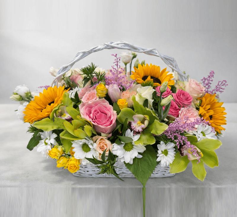 Ova elegantna cvetna korpa spaja vedrinu suncokreta, nežnost ruža i egzotičnu lepotu orhideja u savršen aranžman za svaku priliku. Kombinacija pastelnih i živih tonova čini je idealnim poklonom za rođendan, zahvalnost, čestitku ili iznenađenje bez posebnog povoda.