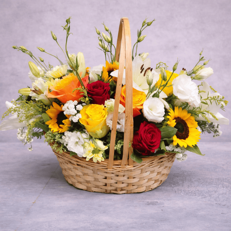 Ovaj šareni aranžman kombinuje suncokrete, ruže, ljiljane, lizijantus i sezonsko cveće, stvarajući bogatu i veselu kompoziciju koja privlači pažnju na prvi pogled. Topli tonovi žute, bele i crvene boje simbolizuju sreću, energiju i ljubav.