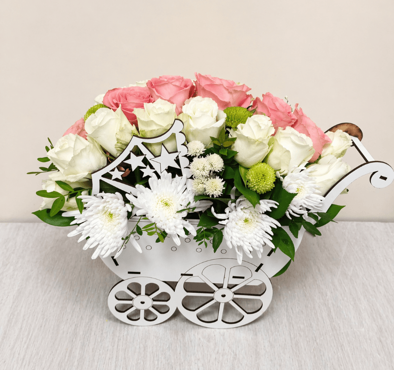 Ovaj prelep cvetni aranžman izrađen je u dekorativnoj kutiji u obliku kolica, što ga čini savršenim poklonom za rođenje bebe ili baby shower proslavu. Kombinacija roze i belih ruža, hrizantema i dekorativnog zelenila daje mu nežan, sofisticiran izgled koji se lako uklapa u svaki prostor.