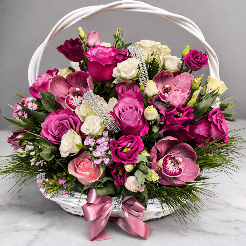 Ovaj luksuzni cvetni aranžman u pletenoj korpi predstavlja savršen spoj elegancije i praktičnosti. Kombinacija ruža, orhideja i dekorativnog sezonskog cveća u nežnim roze, belim i ljubičastim tonovima čini ga idealnim izborom za različite prilike.
