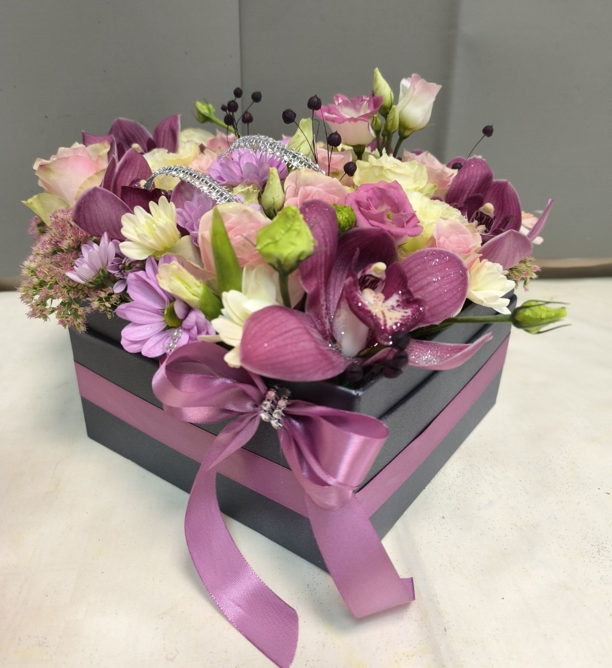 Ovaj sofisticirani cvetni aranžman u dekorativnoj kutiji predstavlja savršen izbor za elegantan i upečatljiv poklon. Kombinacija orhideja, ruža i pažljivo odabranog sezonskog cveća u nežnim roze i ljubičastim tonovima stvara luksuzan i moderan izgled.