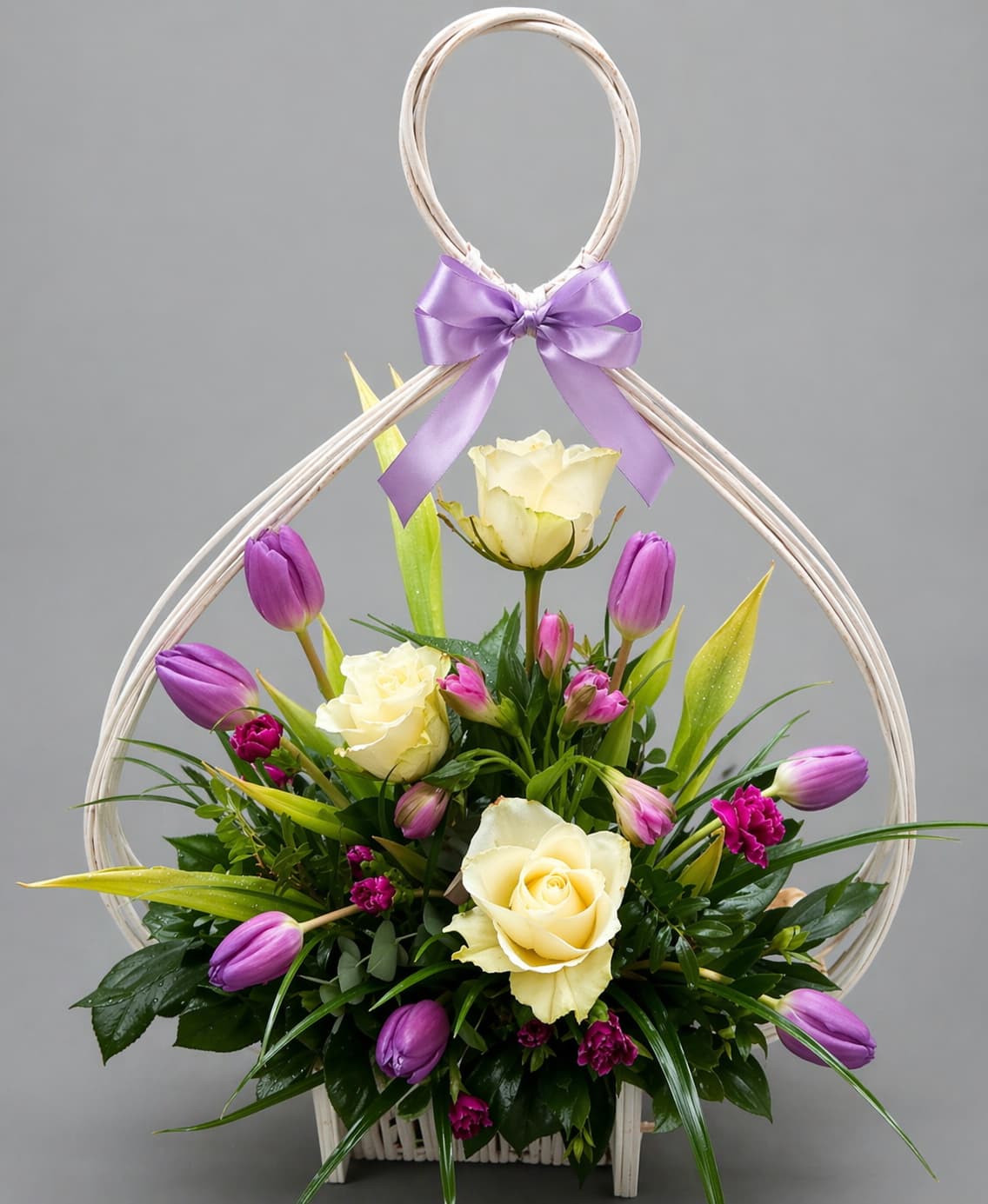 Cvetni aranžman sa ružama i lalama u korpi je nežan i elegantan poklon koji kombinuje klasičnu lepotu i svežinu prolećnog cveća. Spoj belih ruža i ljubičastih lala daje ovom aranžmanu poseban šarm i sklad boja koji lako privlači pažnju.