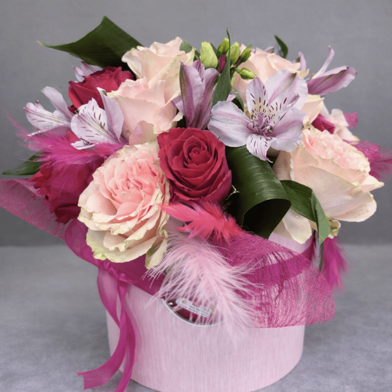 Ovaj aranžman kombinuje ruže u nežnim roze i krem tonovima, uz dekorativnu alstromeriju i zelenilo, dok pink detalji i perje daju poseban, moderan i razigran izgled. Smešten u elegantnu kutiju, predstavlja savršen spoj romantike i stila.