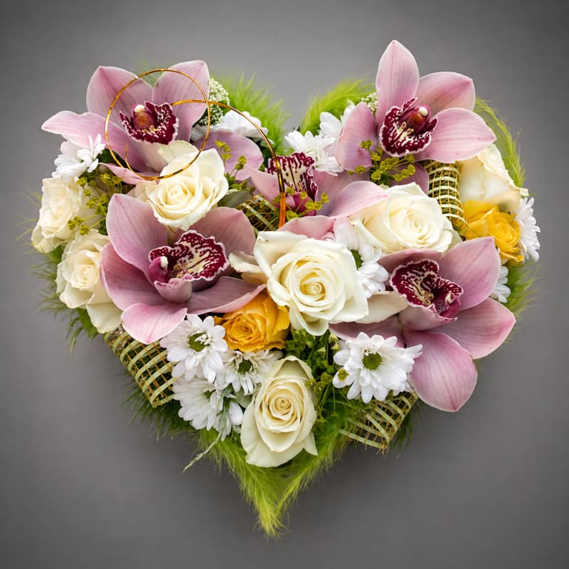 Nežan aranžman u obliku srca, sastavljen od prelepih orhideja, ruža i sezonskog cveća, predstavlja savršen spoj romantike i elegancije. Pastelne nijanse u kombinaciji sa belim i toplim tonovima čine ovaj aranžman idealnim izborom za posebne prilike kada želite da pokažete pažnju i emociju na suptilan način.