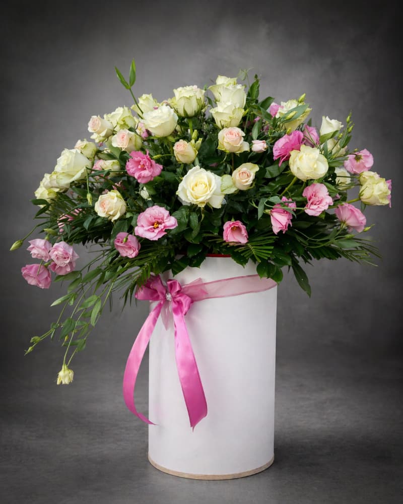 Ekskluzivni cvetni aranžman visine 1,2m, koji spaja eleganciju i sofisticiranost kroz pažljivo odabrane bele ruže i nežne roze lizijantuse. Ovaj luksuzni buket aranžiran je u modernoj dekorativnoj kutiji, uz dodatak bogatog zelenila koje naglašava prirodnu lepotu cvetova.