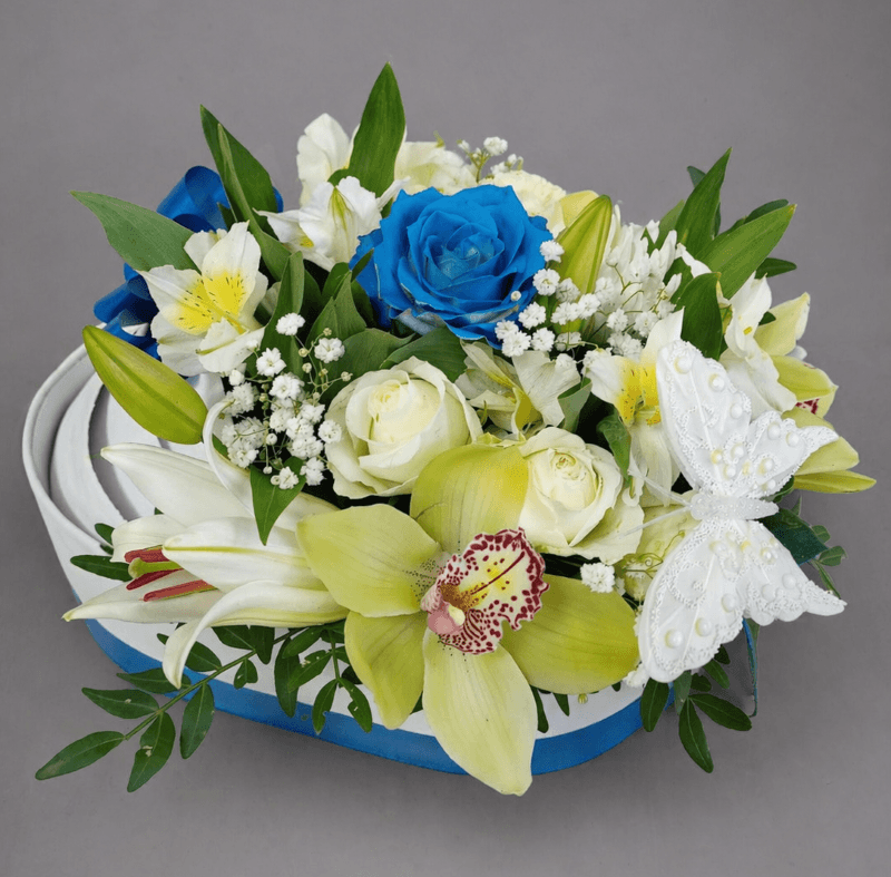 U ovom aranžmanu dominiraju ruže, ljiljani i orhideje, uz dodatak dekorativnog zelenila i sitnih cvetova koji daju bogat i elegantan izgled. Poseban detalj – dekorativni leptir – dodatno naglašava nežnost i simboliku novog života.