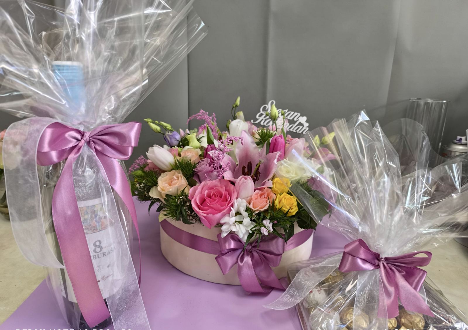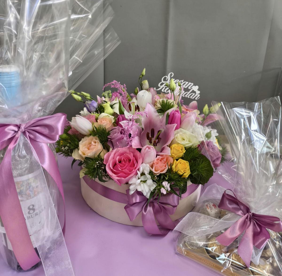 Aranžman sa cvećem, vinom ZVONKO BOGDAN Osam tamburaša 750ml i Ferrero bombonama predstavlja idealan izbor za elegantan i pažljivo osmišljen korporativni poklon. Kombinacija svežeg cveća, kvalitetnog vina i poznatih čokoladnih bombona ostavlja profesionalan i lep utisak.