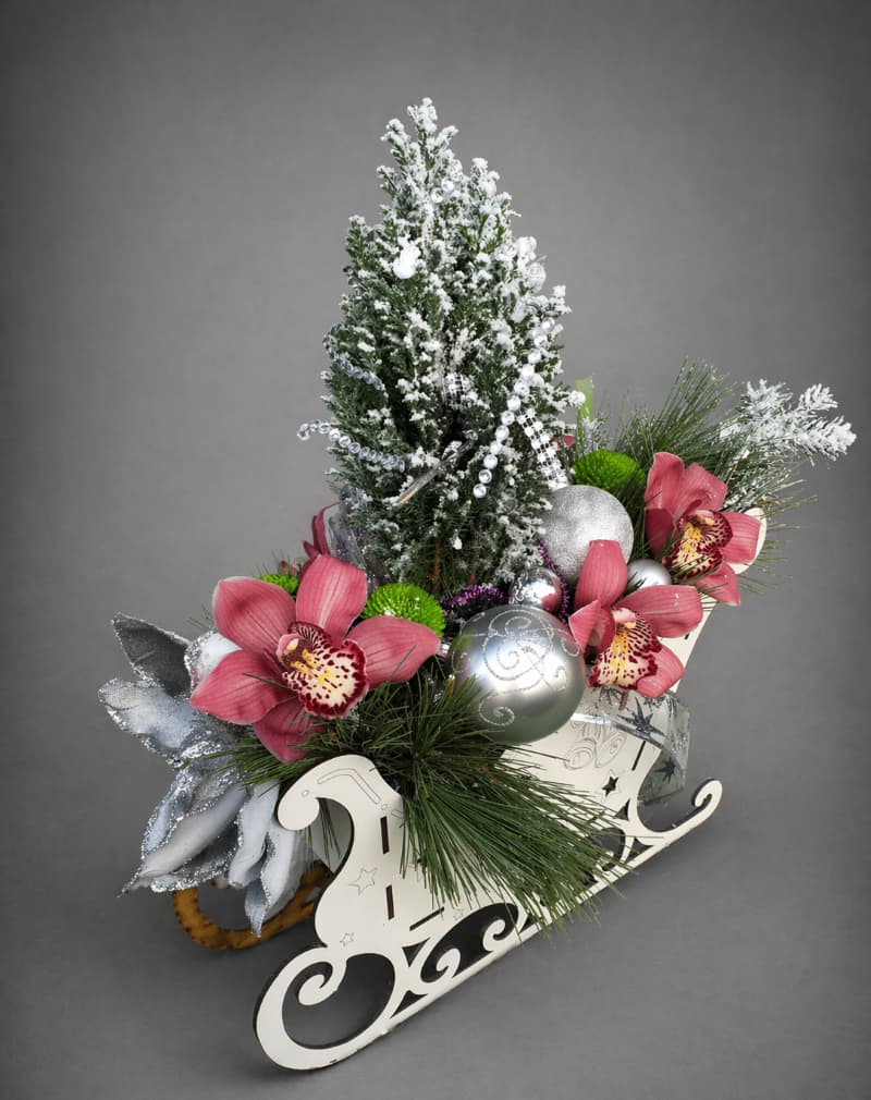 Postavljen u dekorativne sanke, ovaj aranžman je idealan kao novogodišnji poklon, dekoracija za dom ili poslovni prostor. Spoj prirodnih elemenata i prazničnih detalja čini ga upečatljivim i drugačijim izborom.