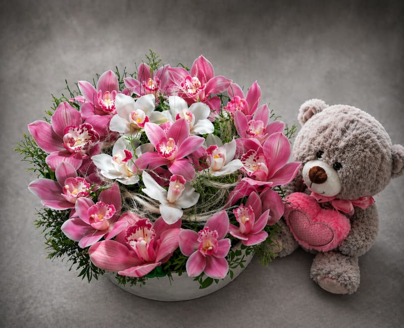 Orhideje simbolizuju lepotu, sofisticiranost i ljubav, dok plišani meda donosi toplinu i dodatnu emotivnu vrednost. Idealan je izbor za rođendane, godišnjice, Dan zaljubljenih ili kao iznenađenje koje ostavlja snažan utisak.