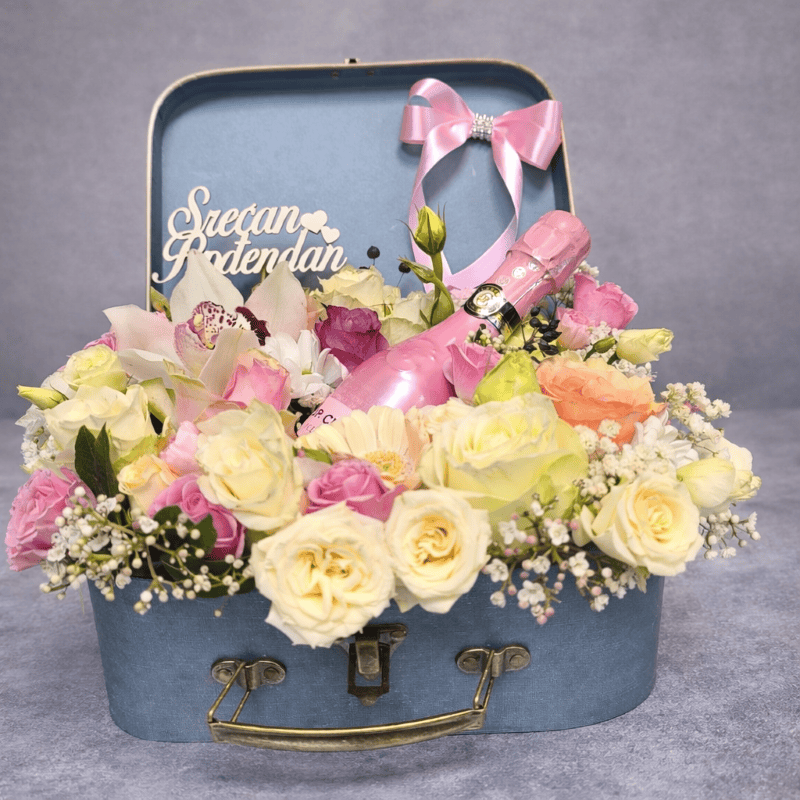 Dekorativna kutija sa natpisom „Srećan rođendan“ i elegantnom mašnom čini ovaj aranžman savršenim izborom za slavlje i posebne prilike. Kombinacija ruža, orhideje i sezonskog cveća daje sofisticiran i nežan izgled koji će sigurno izmamiti osmeh.