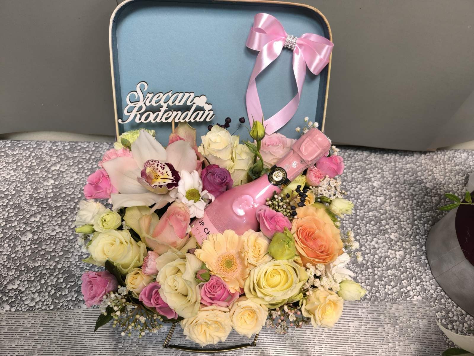 Oduševite dragu osobu jedinstvenim rođendanskim aranžmanom koji spaja eleganciju cveća i poseban poklon u jednom. Ovaj luksuzni aranžman sadrži pažljivo odabrano sveže cveće u nežnim tonovima, uz dodatak pića koje upotpunjuje celokupan doživljaj.