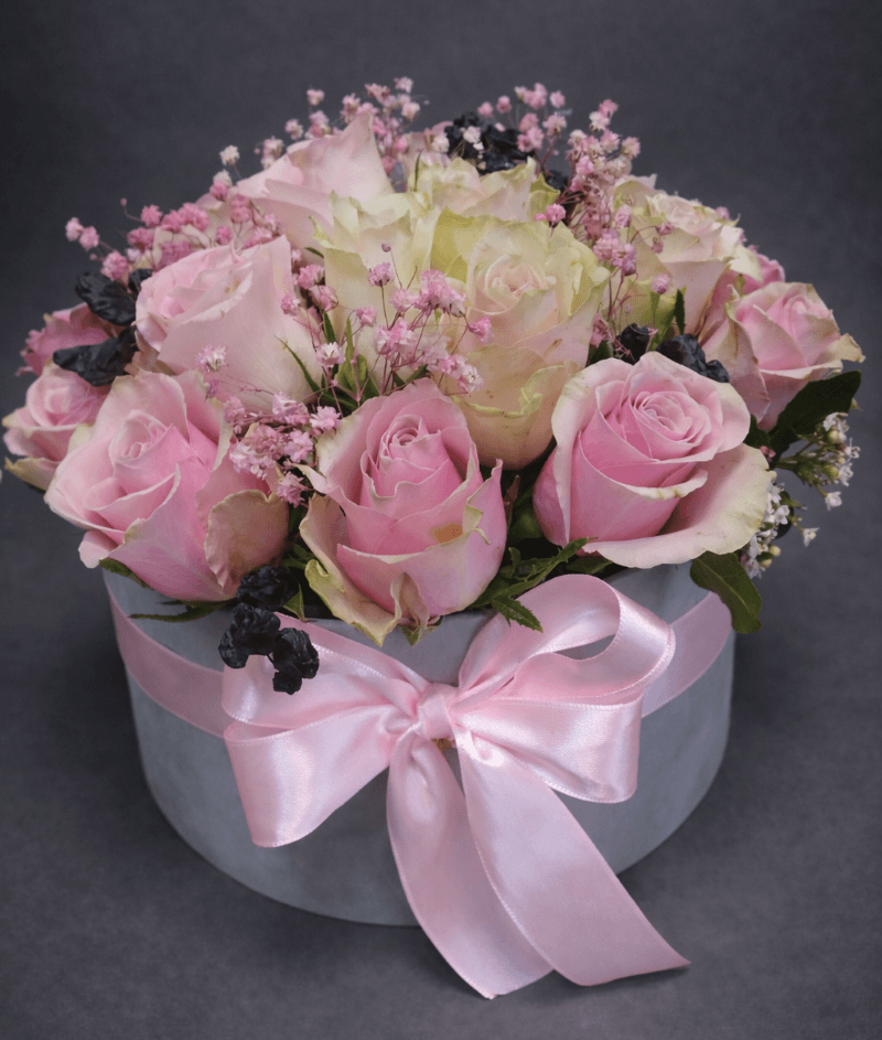 Elegantne roze ruže u modernoj kutiji sa mašnom. Savršen poklon za rođendan, iznenađenje ili posebne prilike.