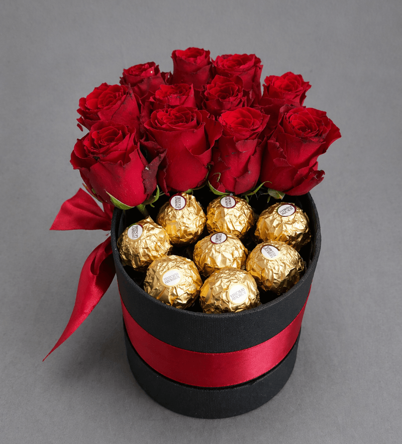 Elegantna kombinacija crvenih ruža i Ferrero bombona u dekorativnoj kutiji predstavlja savršen poklon za posebne prilike. Duboka crvena boja ruža simbolizuje ljubav i pažnju, dok čokoladne praline dodatno upotpunjuju celokupan doživljaj.