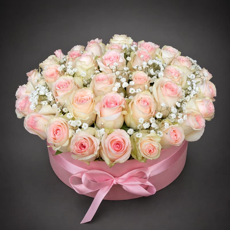 Romantični aranžman od 41 ruže u kutiji odiše nežnošću i elegancijom. Svetlo roze ruže upotpunjene finim detaljima gipsofile, stvara sofisticiran i harmoničan izgled koji osvaja na prvi pogled.