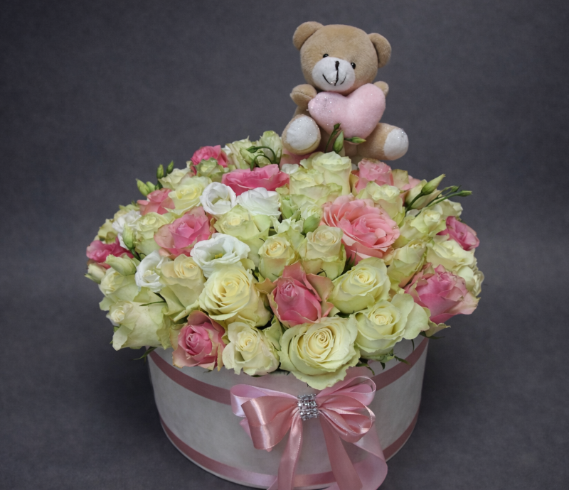 Veliki cvetni boks sa ružama i lizijantusom predstavlja bogat i efektan poklon koji ostavlja snažan utisak.