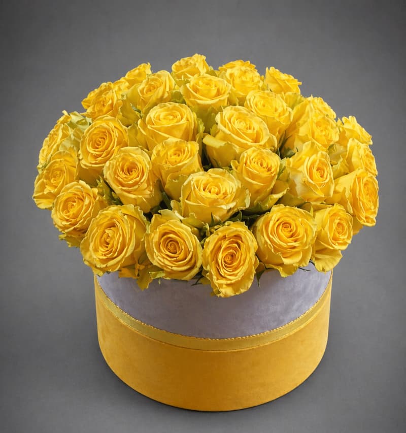 Aranžman od 41 žute ruže u dekorativnom boksu koji donosi svetlost, radost i pozitivnu energiju u svaki prostor. Bogata kompozicija ruža u toplim žutim tonovima čini ovaj aranžman upečatljivim i vedrim poklonom.