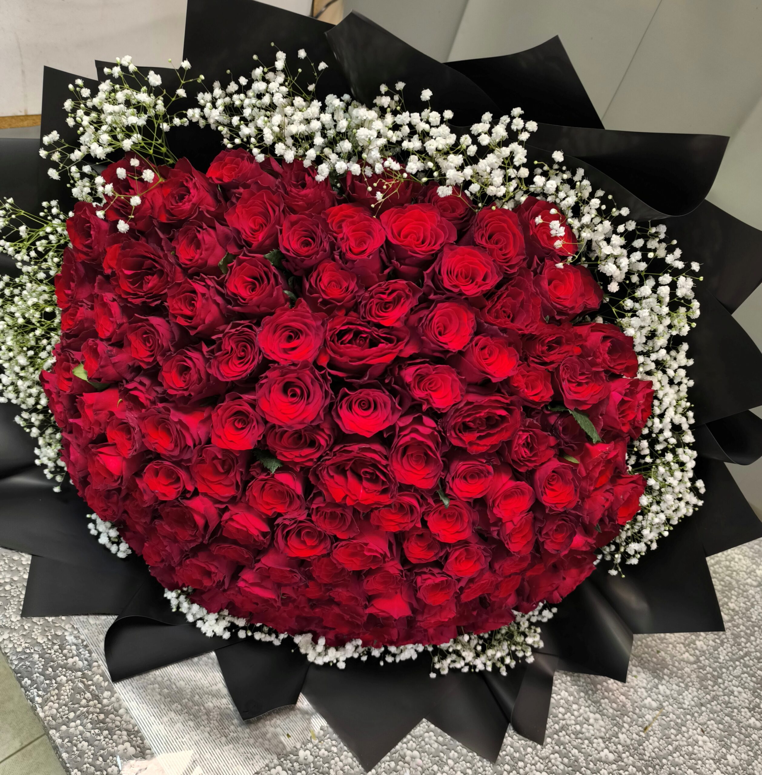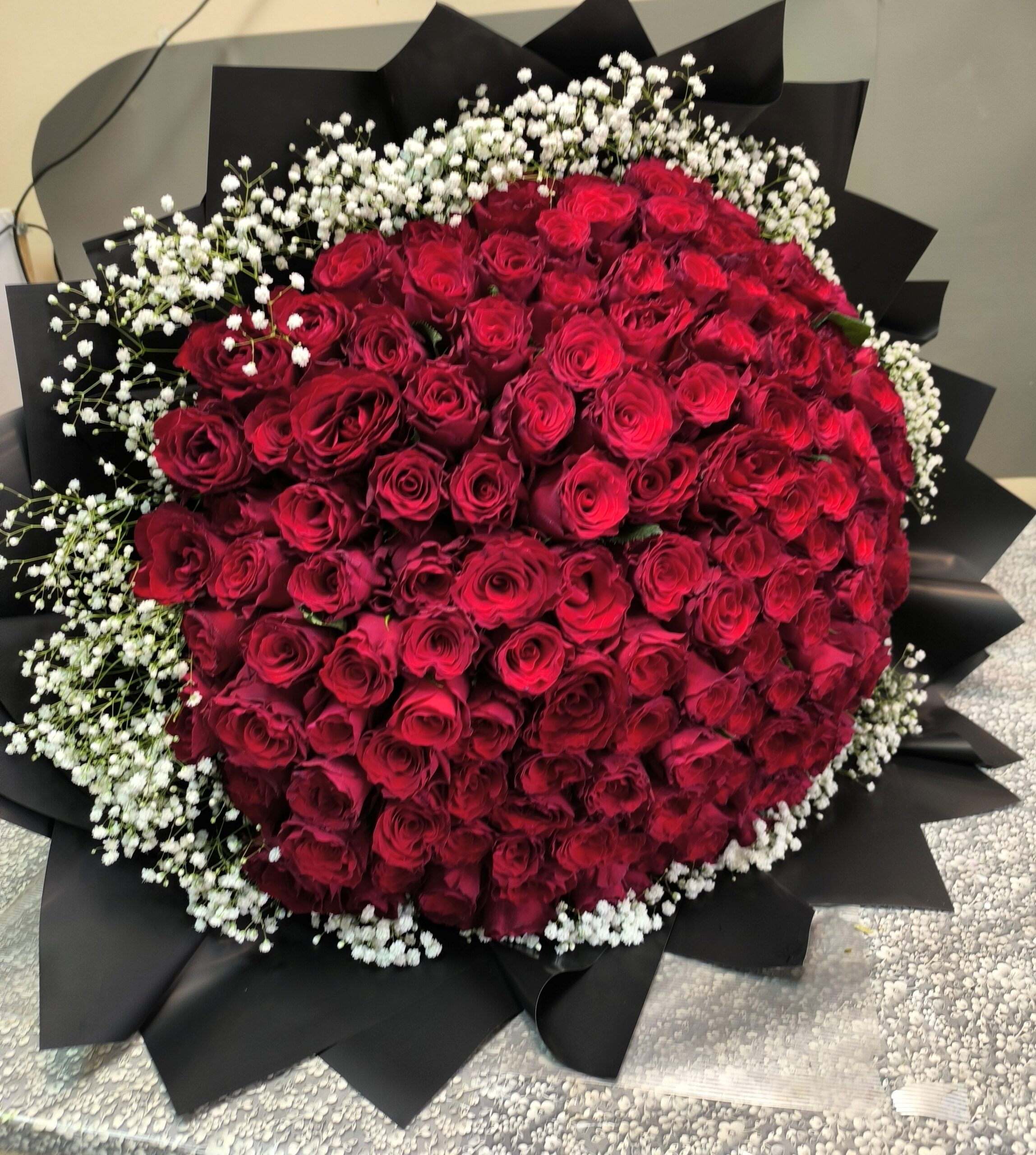 Premium buket od 101 crvene ruže iz ponude Cvećare Girasole osmišljen je za one koji žele da ostave snažan, elegantan i nezaboravan utisak. Svaka ruža pažljivo je odabrana zbog svoje punoće, duboke crvene boje i besprekorne forme, dok je kompozicija dodatno naglašena sofisticiranim crnim pakovanjem i nežnim detaljima gipsofile.