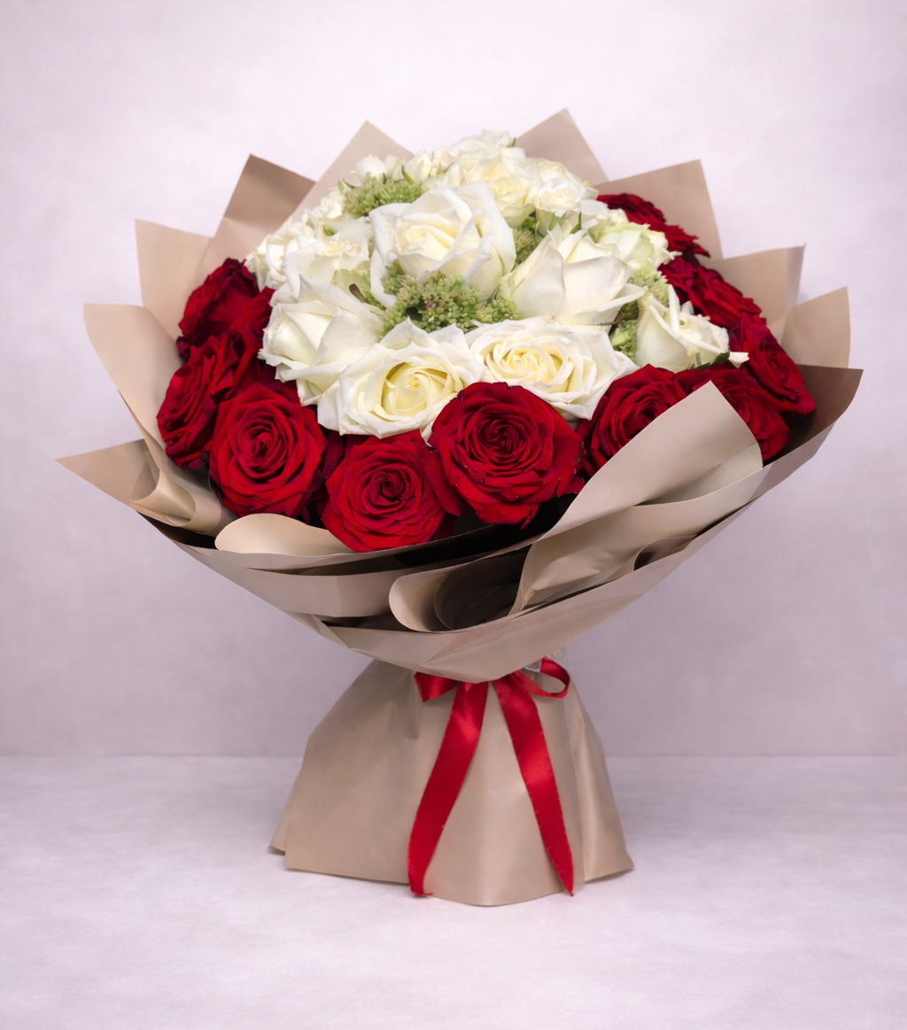 Ovaj prefinjeni buket od 35 ruža predstavlja savršenu harmoniju strasti i elegancije. Kombinacija crvenih i belih ruža simbolizuje ljubav, poštovanje i nežnost, čineći ga idealnim poklonom za rođendane, godišnjice, Dan zaljubljenih ili bilo koju posebnu priliku.