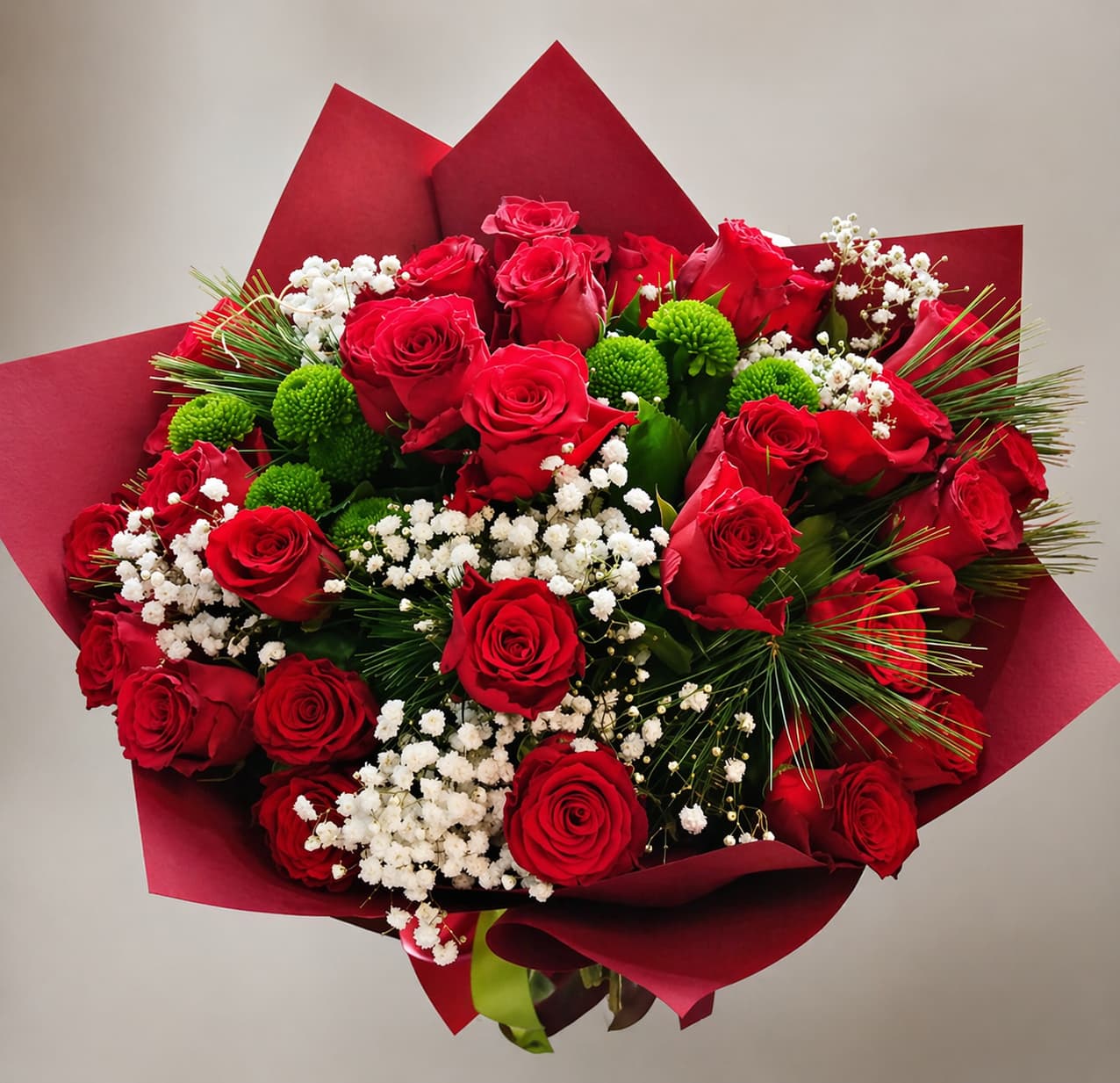 Buket crvenih ruža sa gipsofilom i zelenilom je klasičan i upečatljiv izbor kada želite da poklon nosi snažnu poruku. Crvene ruže simbolizuju ljubav i strast, dok gipsofila i dekorativno zelenilo daju dodatnu punoću i eleganciju ovom buketu.