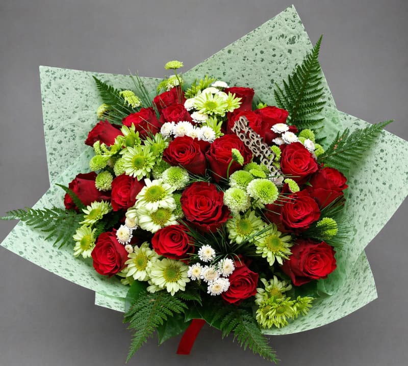 Buket crvenih ruža sa hrizantemama je bogat i upečatljiv aranžman koji kombinuje klasičnu eleganciju i svežinu. Crvene ruže simbolizuju ljubav i strast, dok hrizanteme unose dodatnu punoću i kontrast koji ovaj buket čine vizuelno zanimljivim i raskošnim.