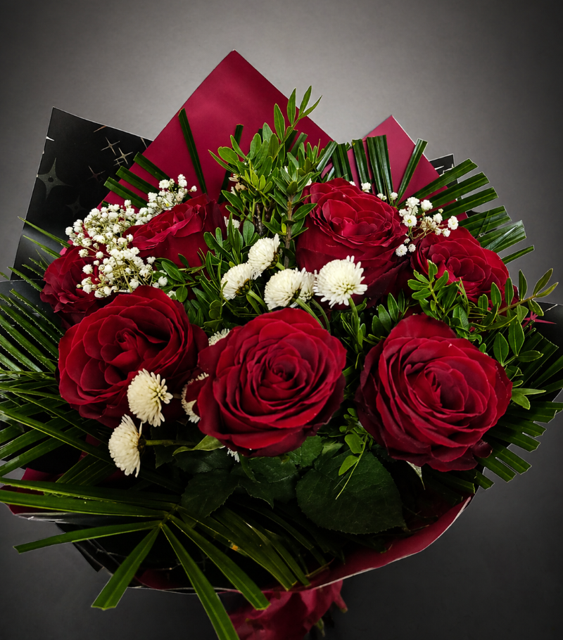 Klasičan buket od 9 crvenih ruža koji nikada ne izlazi iz mode. Pažljivo aranžirane ruže, upotpunjene dekorativnim zelenilom i sitnim cvetovima, stvaraju skladnu i elegantnu kompoziciju.