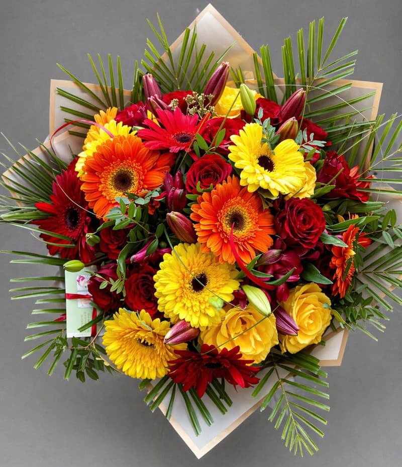 Različite boje – crvena, žuta i narandžasta – čine ovaj buket savršenim izborom kada želite da poklon bude vedar, topao i pun života.