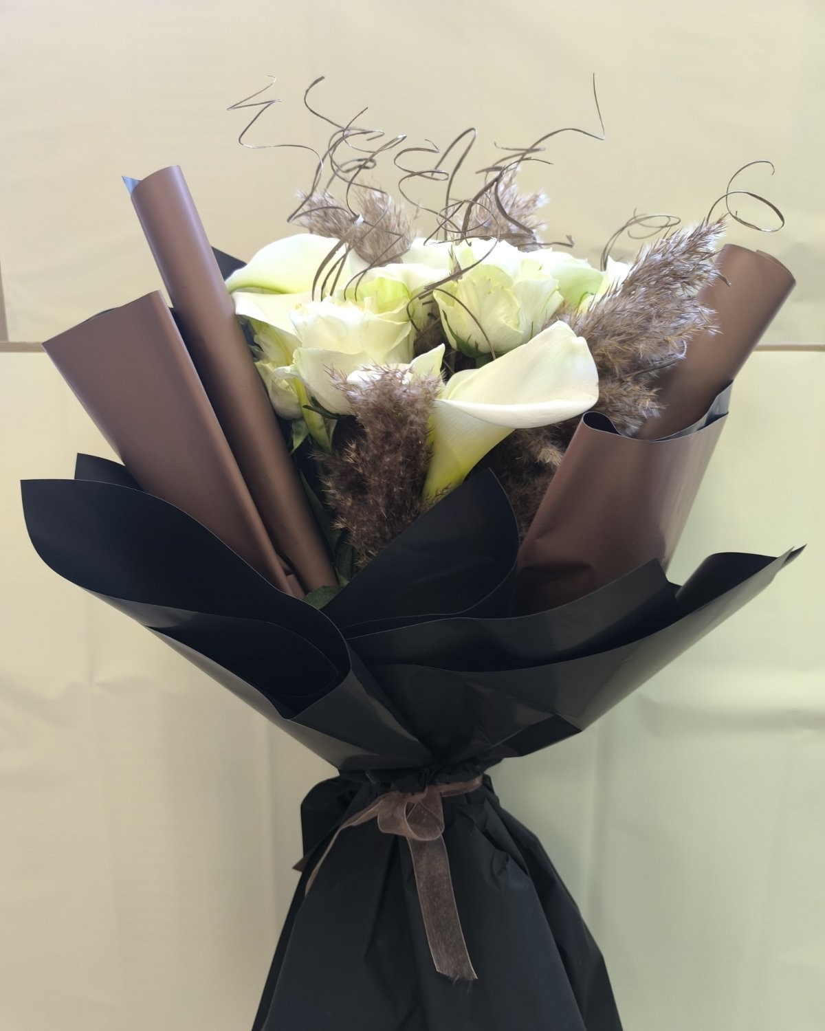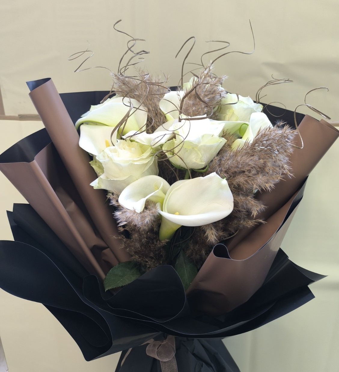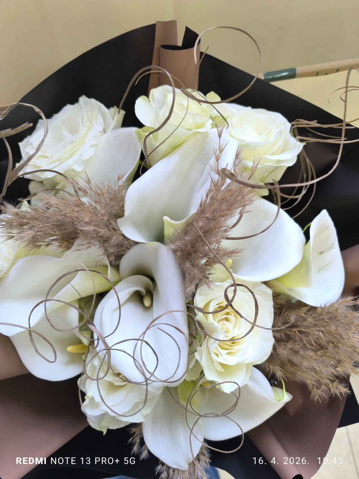 Ovaj ekskluzivni buket donosi savršen spoj elegancije i modernog dizajna. Bele kale i ruže simbolizuju sofisticiranost i čistoću, dok pampas trava i dekorativni elementi dodaju dozu luksuza i trendi izgleda.
