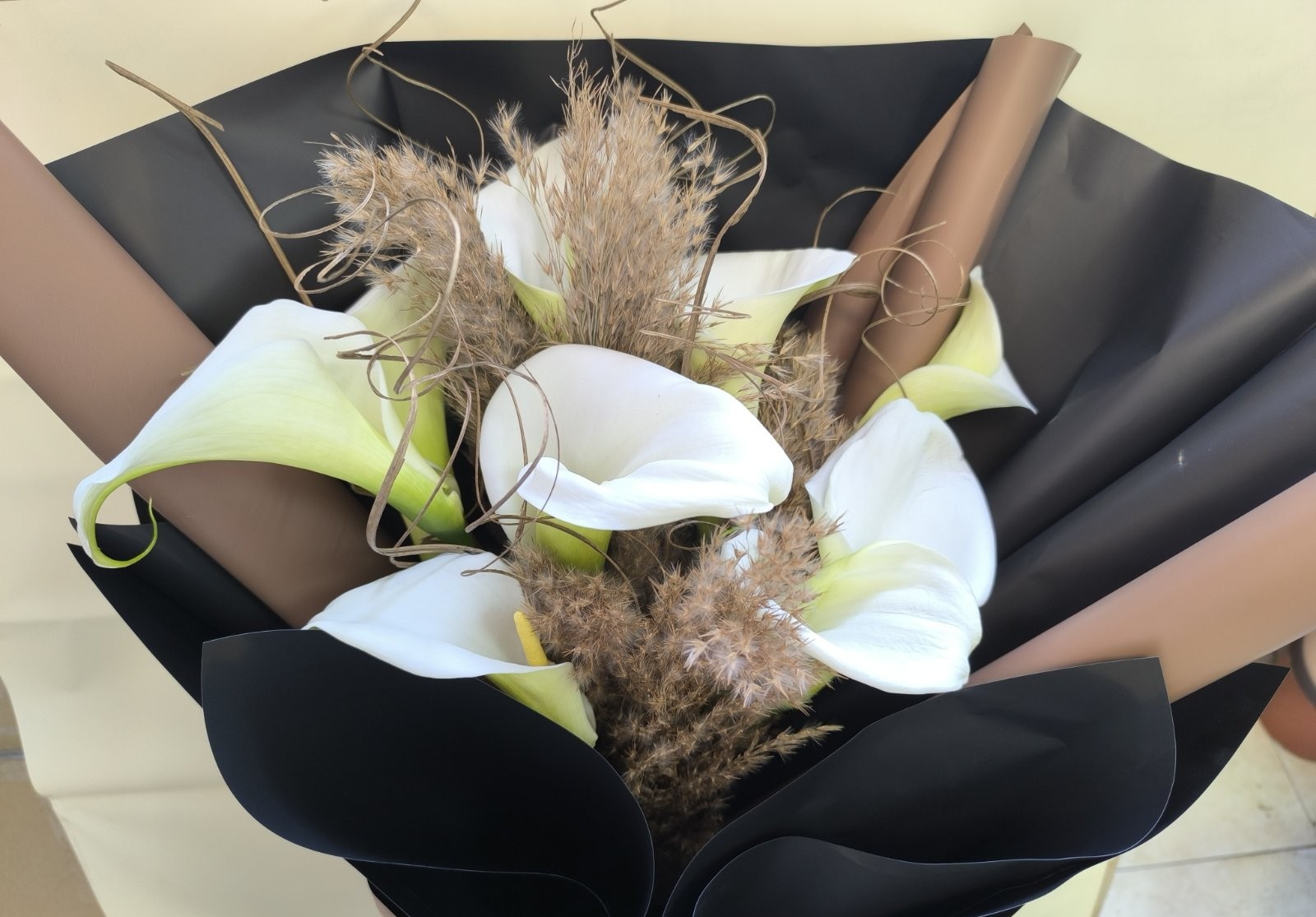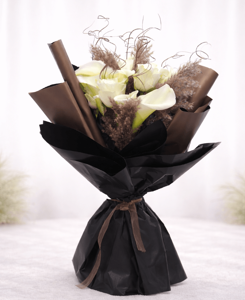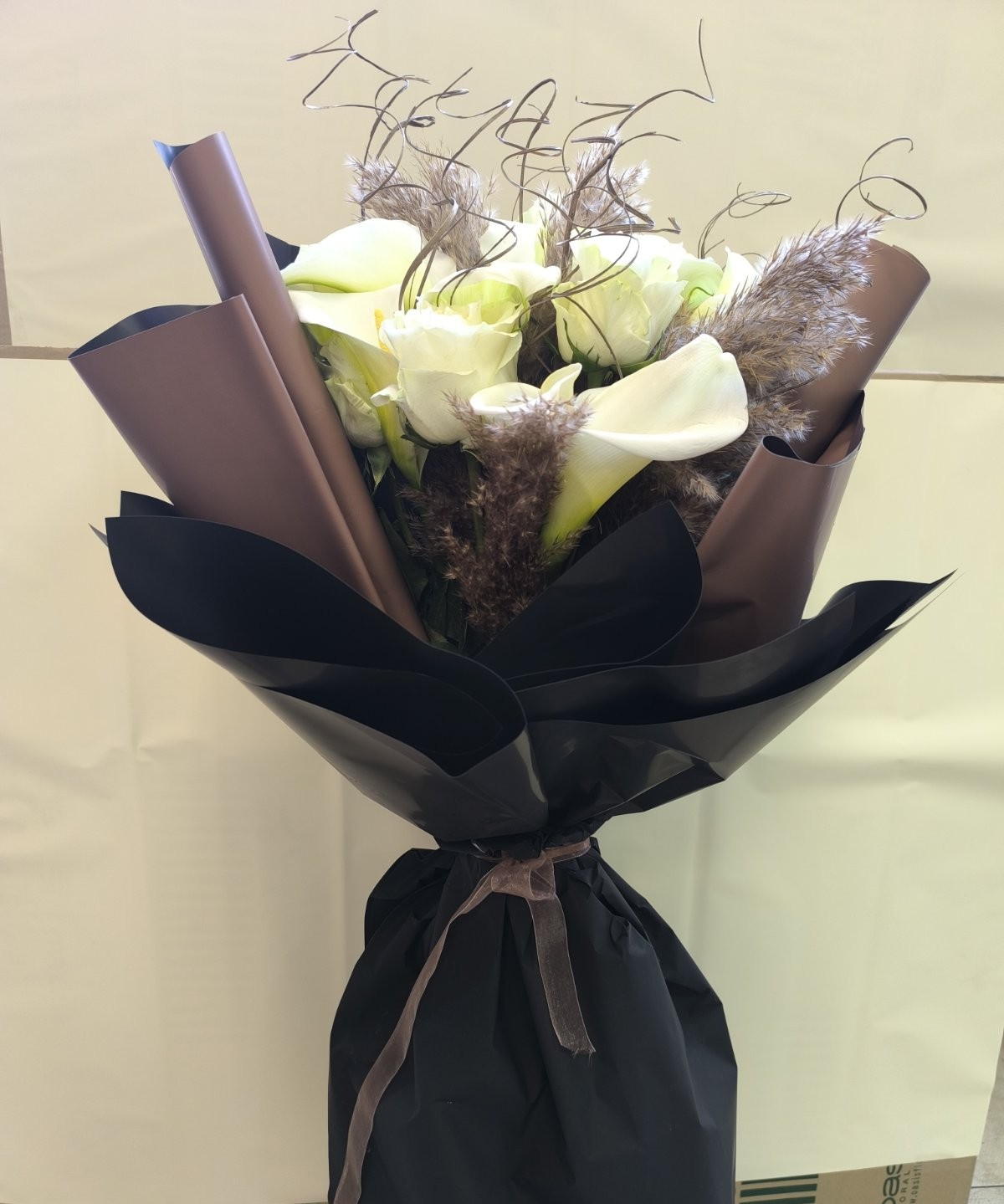 Ovaj ekskluzivni buket donosi savršen spoj elegancije i modernog dizajna. Bele kale i ruže simbolizuju sofisticiranost i čistoću, dok pampas trava i dekorativni elementi dodaju dozu luksuza i trendi izgleda.