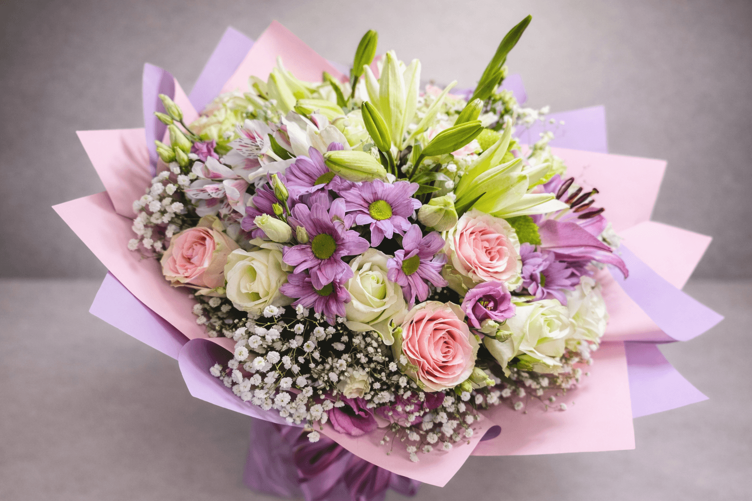 Ovaj pastelni buket sa ljiljanima i ružama savršen je izbor kada želite brzo i jednostavno online poručivanje cveća za posebne trenutke. Njegova pažljivo uklopljena kombinacija nežnih tonova i svežeg cveća čini ga univerzalnim poklonom za različite prilike.