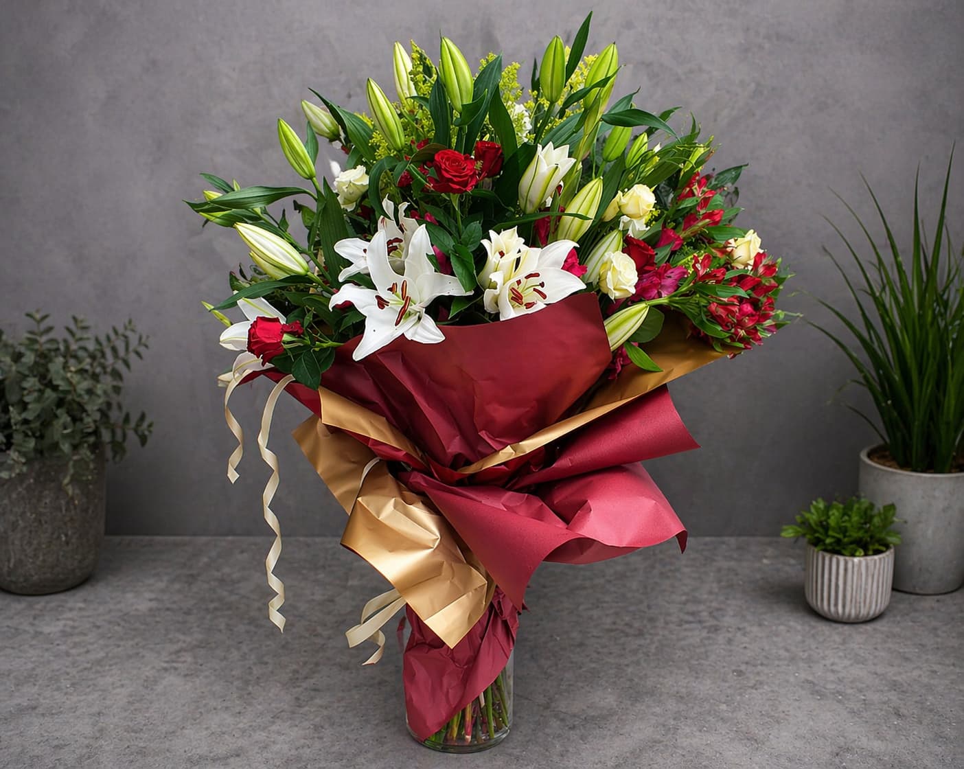 Elegantni XXL buket sa ružama i ljiljanima je raskošan aranžman koji je stvoren da ostavi snažan utisak. Kombinacija velikih, mirisnih ljiljana, klasičnih ruža i bogatog zelenila čini ovaj buket izuzetno upečatljivim i vizuelno bogatim.